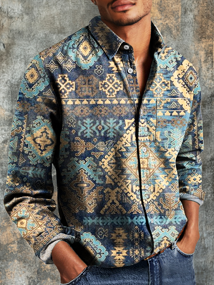 Men's Vintage Aged Ethnic Geometric Art Print Long Sleeve Pocket Shirt