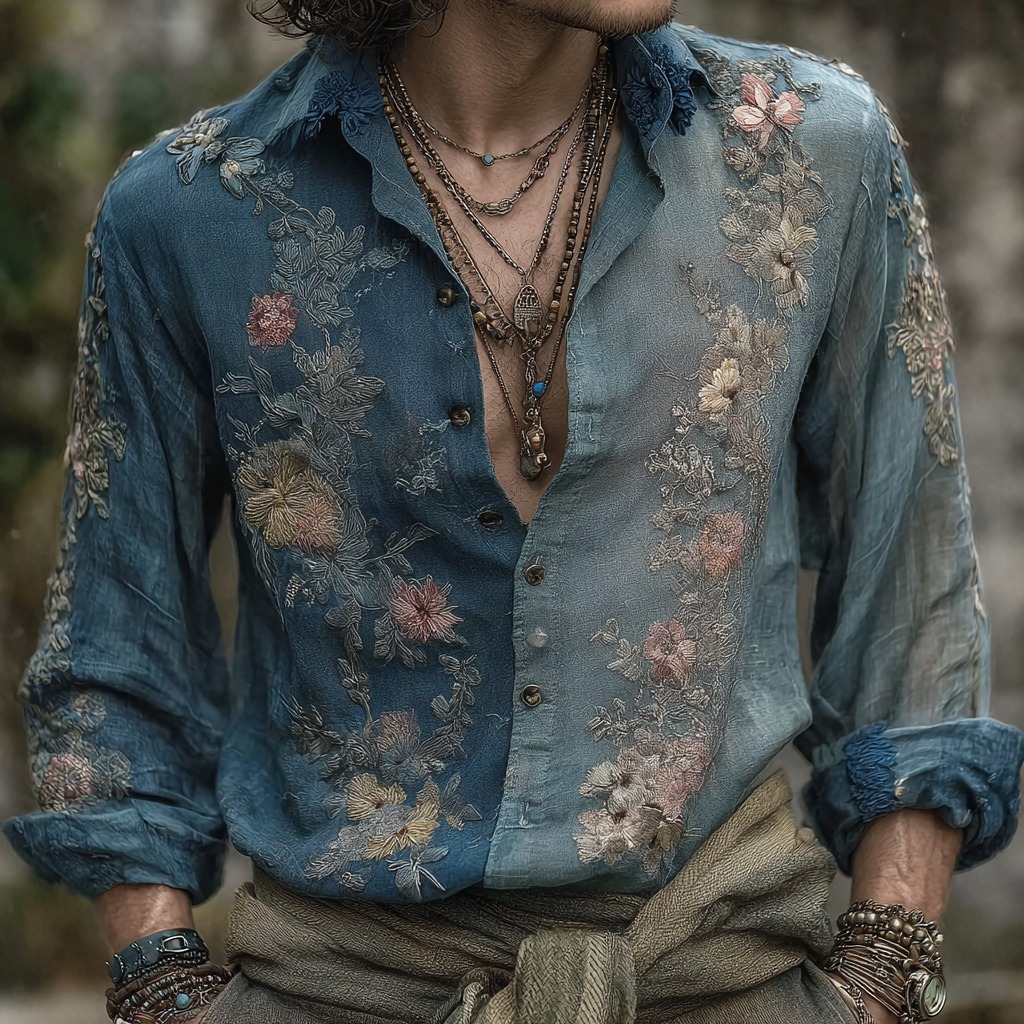 Men's Vintage Bohemian Floral Embroidered Linen Shirt