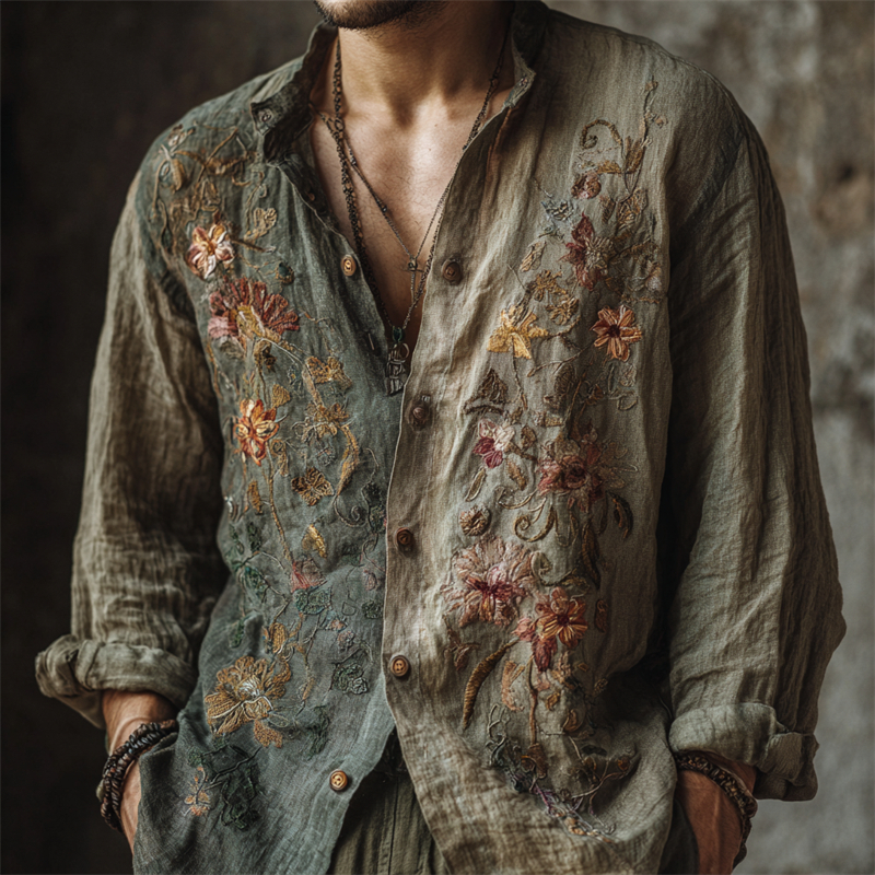 Men's Vintage Boho Floral Embroidered Contrast Linen Shirt