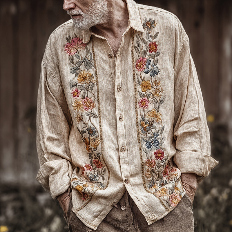 Men's Vintage Boho Floral Embroidered Cozy Linen Shirt