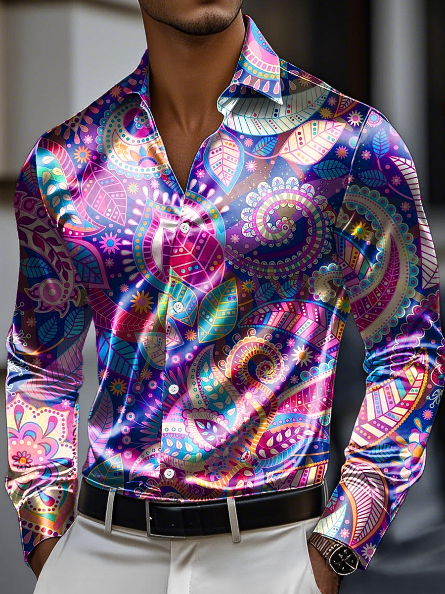 Men's Vintage Botanical Color Art Print Premium Satin Long Sleeve Shirt