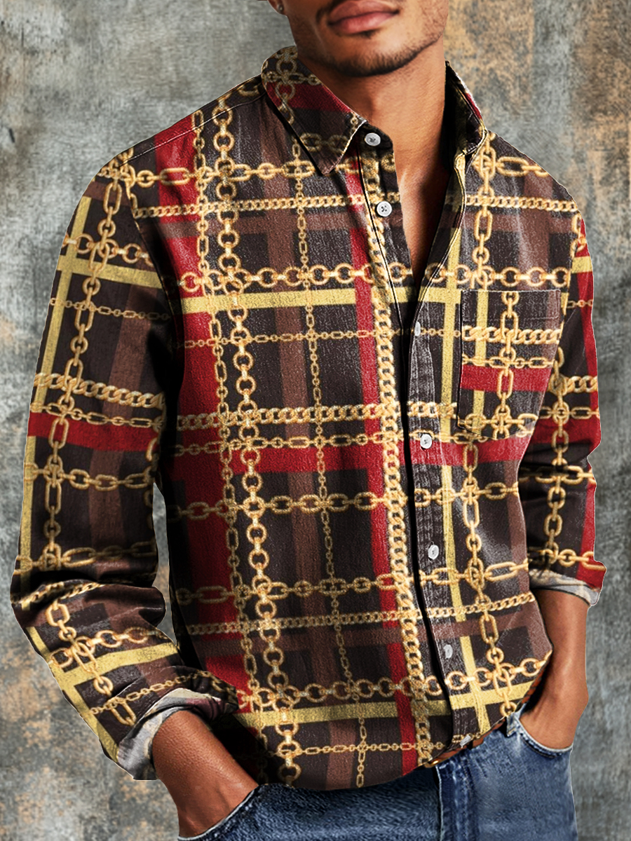 Men's Vintage Chain Check Art Print Long Sleeve Pocket Shirt