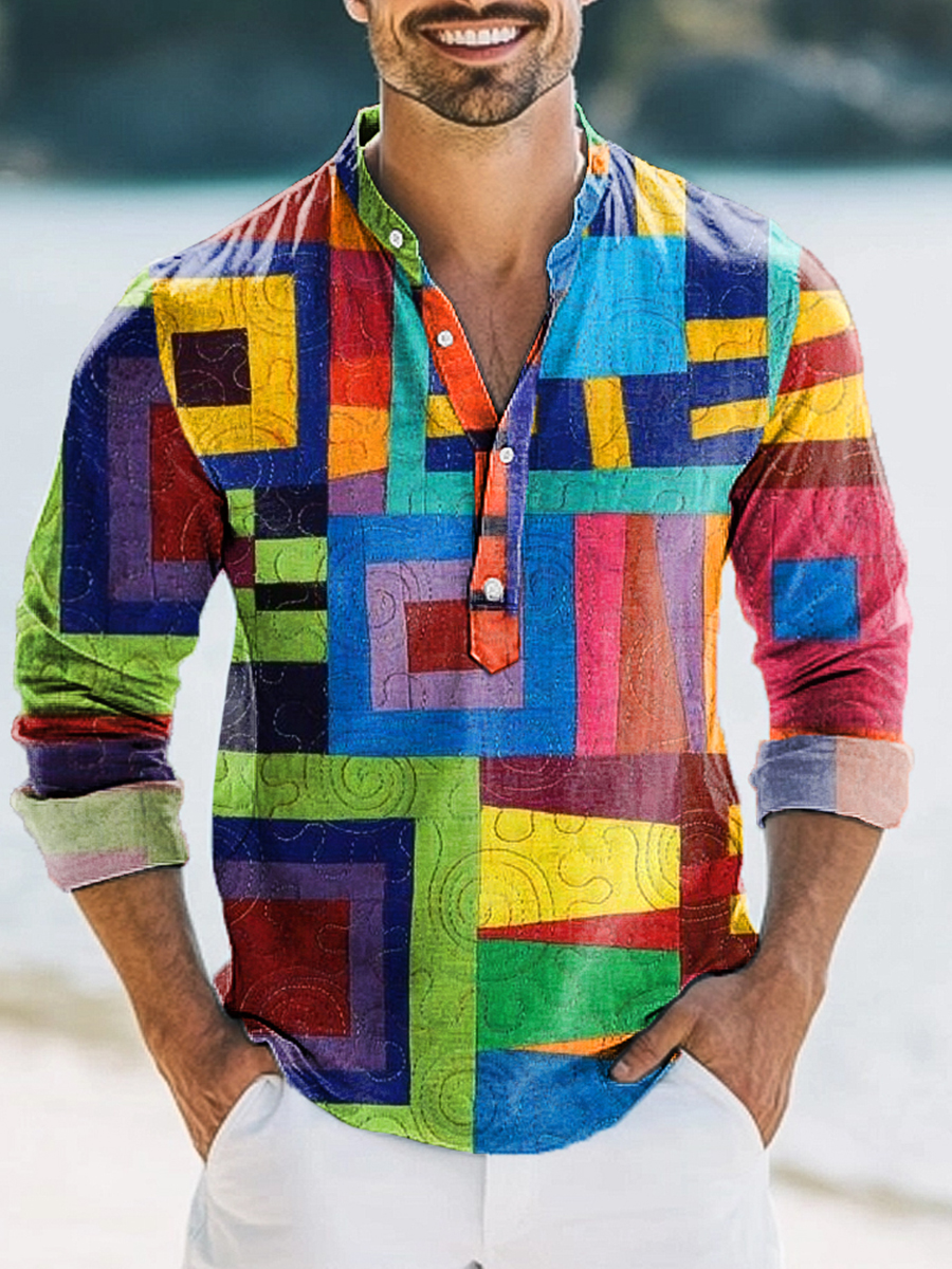Men's Vintage Color Geometric Art Print Long Sleeve Henley Shirt