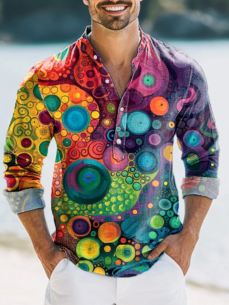 Men's Vintage Color Line Dot Art Print Long Sleeve Henley Shirt