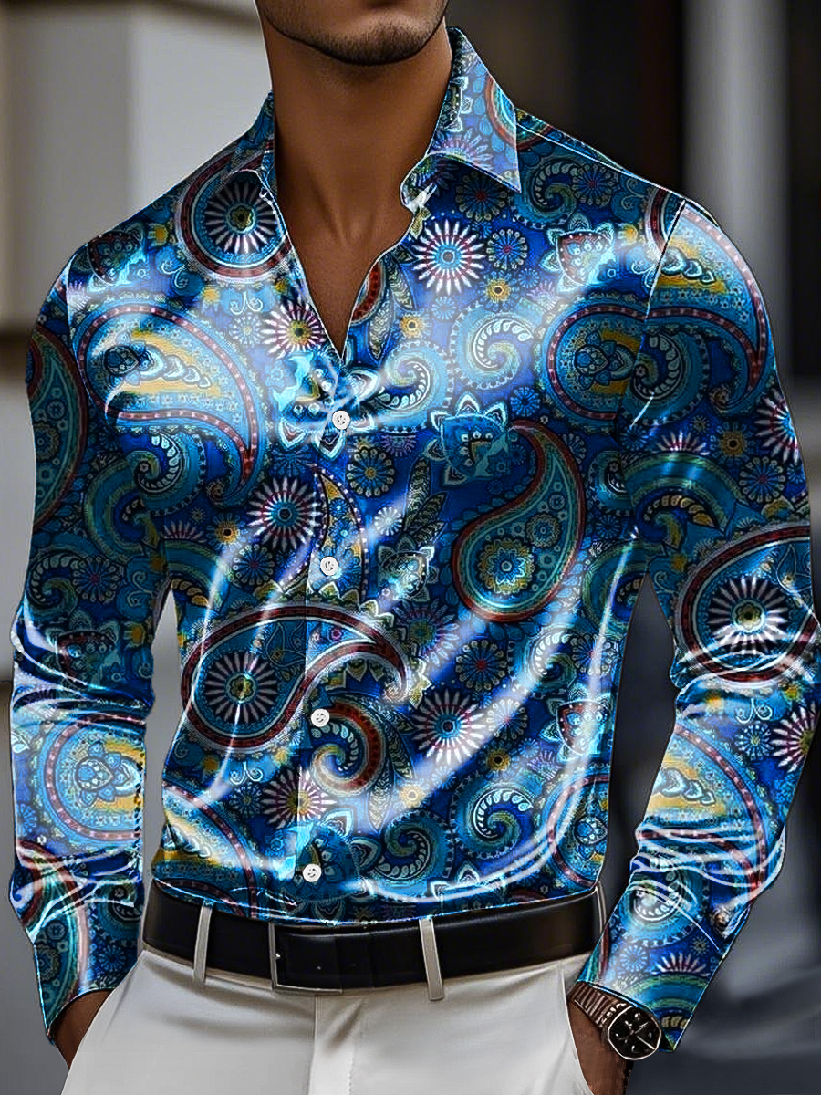 Men's Vintage Color Paisley Art Print Premium Satin Long Sleeve Shirt