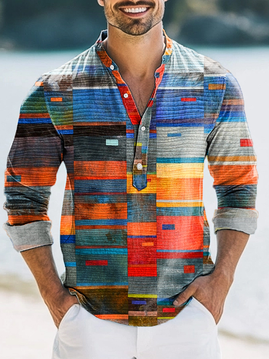 Men's Vintage Color Stripe Geometric Art Print Long Sleeve Henley Shirt