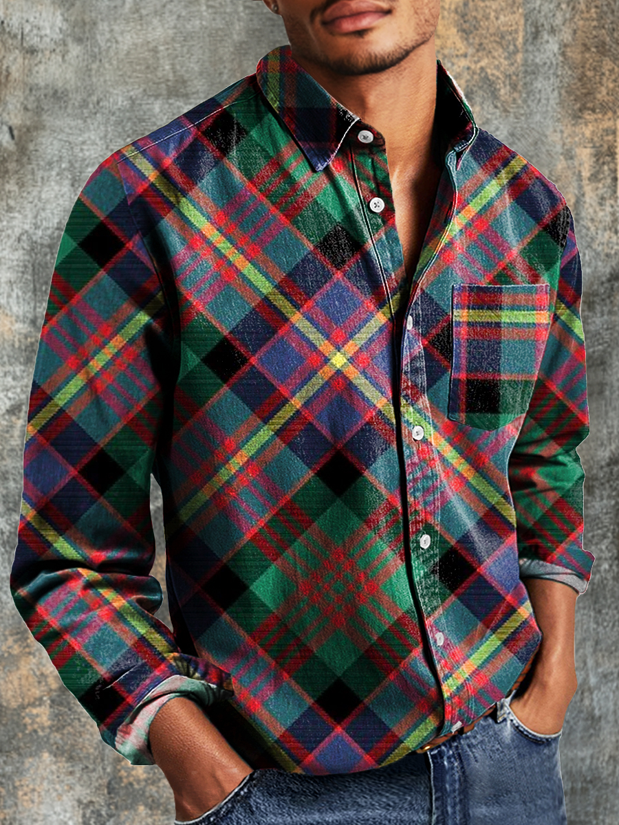 Men's Vintage Colorful Plaid Art Print Long Sleeve Pocket Shirt