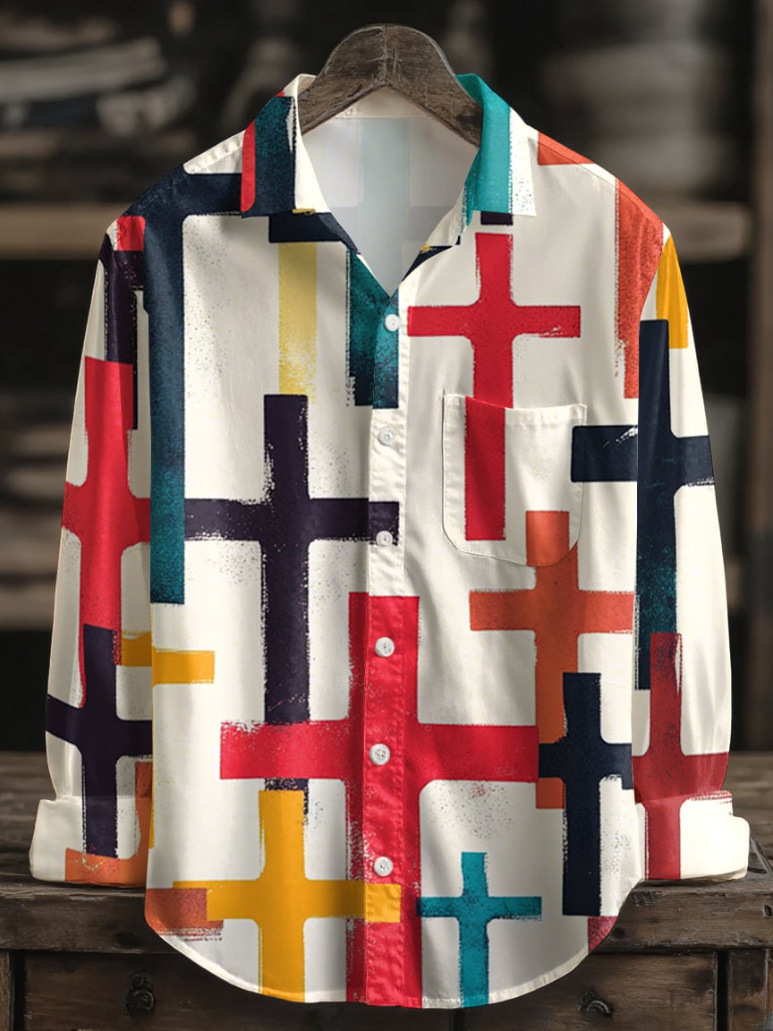 Men's Vintage Cross Abstract Art Casual Faith Long Sleeve Shirt
