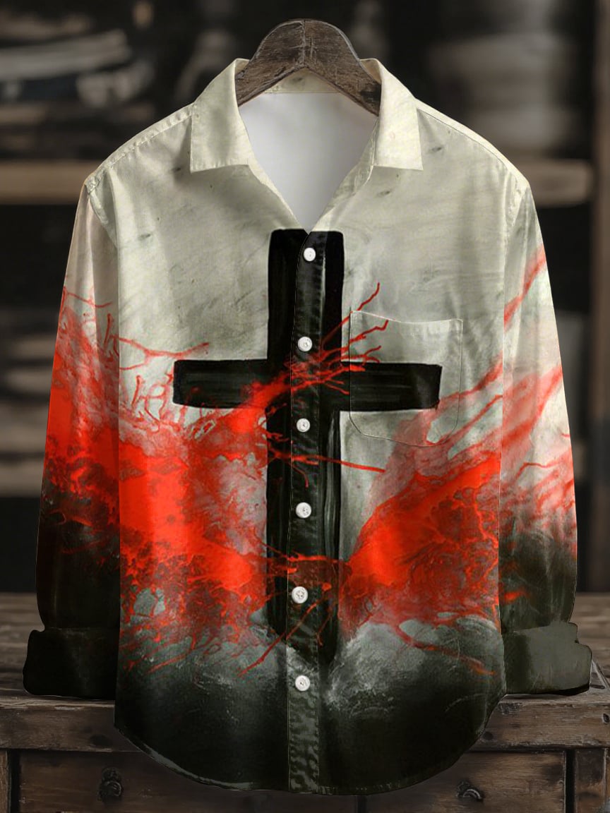 Men's Vintage Cross Abstract Art Casual Faith Long Sleeve Shirt