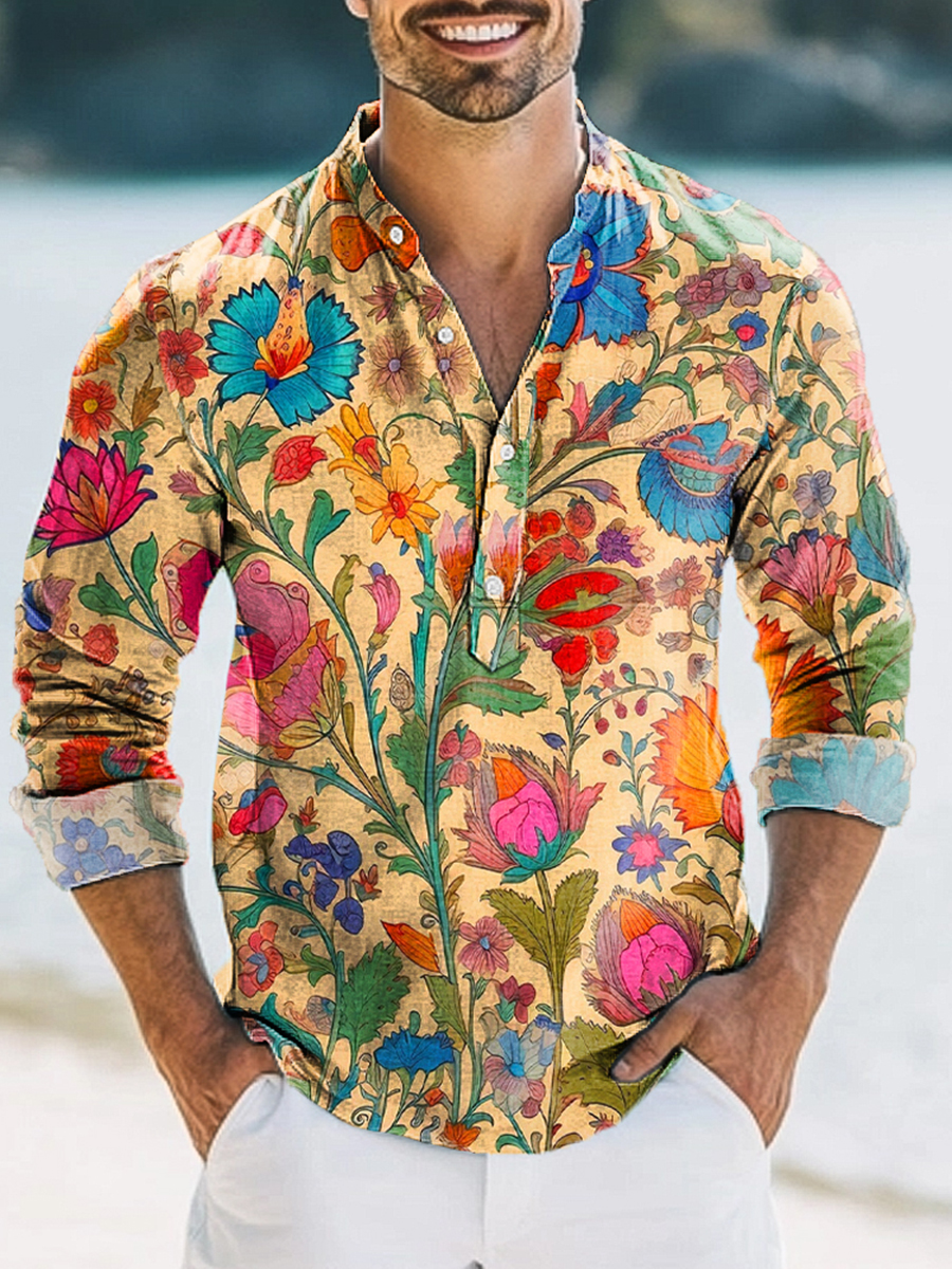 Men's Vintage Ethnic Floral Art Print Long Sleeve Henley Shirt