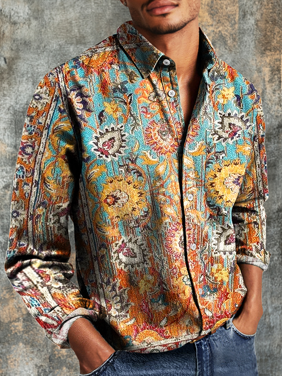 Men's Vintage Ethnic Floral Art Print Long Sleeve Pocket Shirt