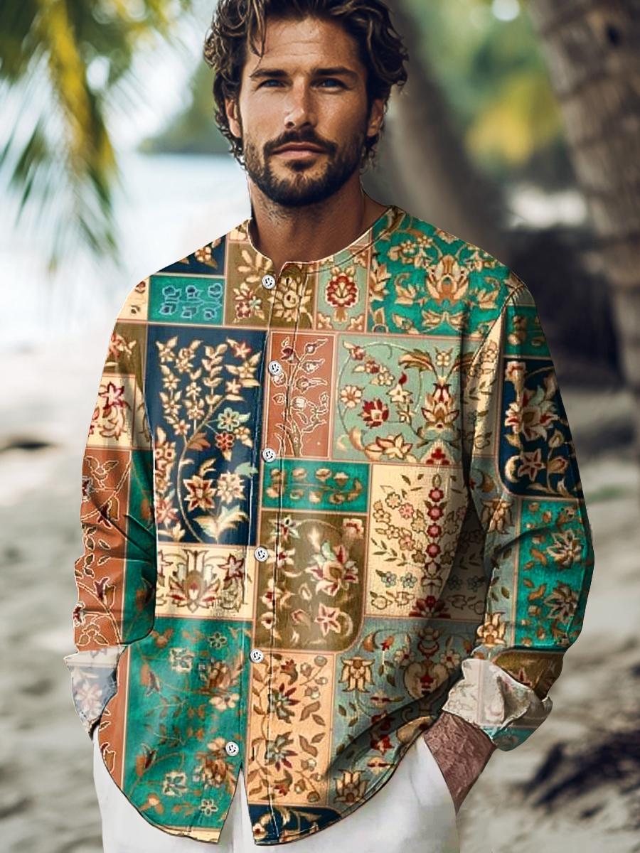 Men's Vintage Ethnic Patchwork Floral Art Print Long Sleeve Pocket Shirt