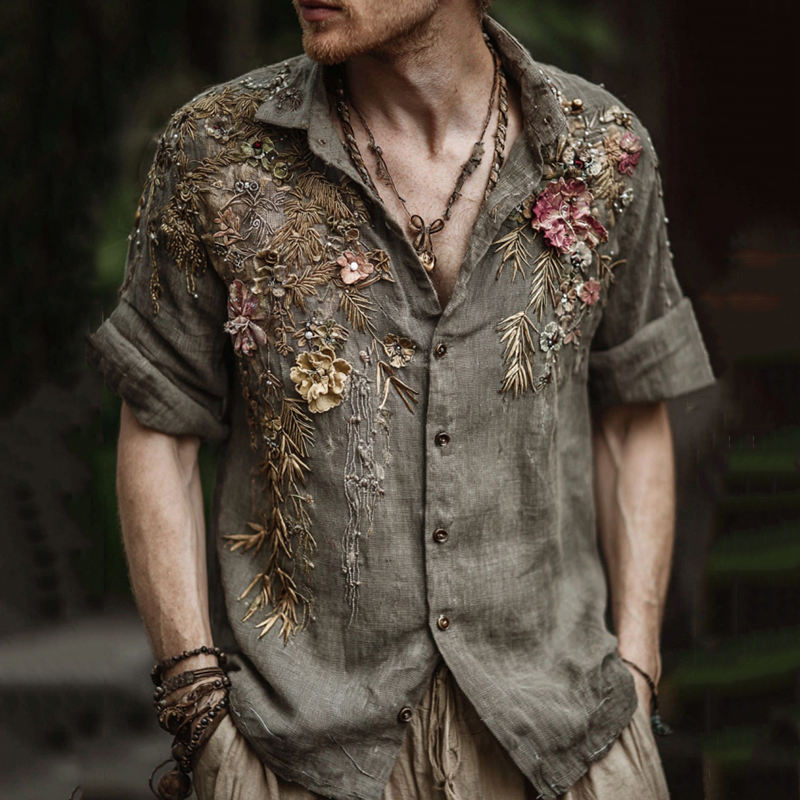 Men's Vintage Floral Embroidered Art Comfy Washed Linen Shirt