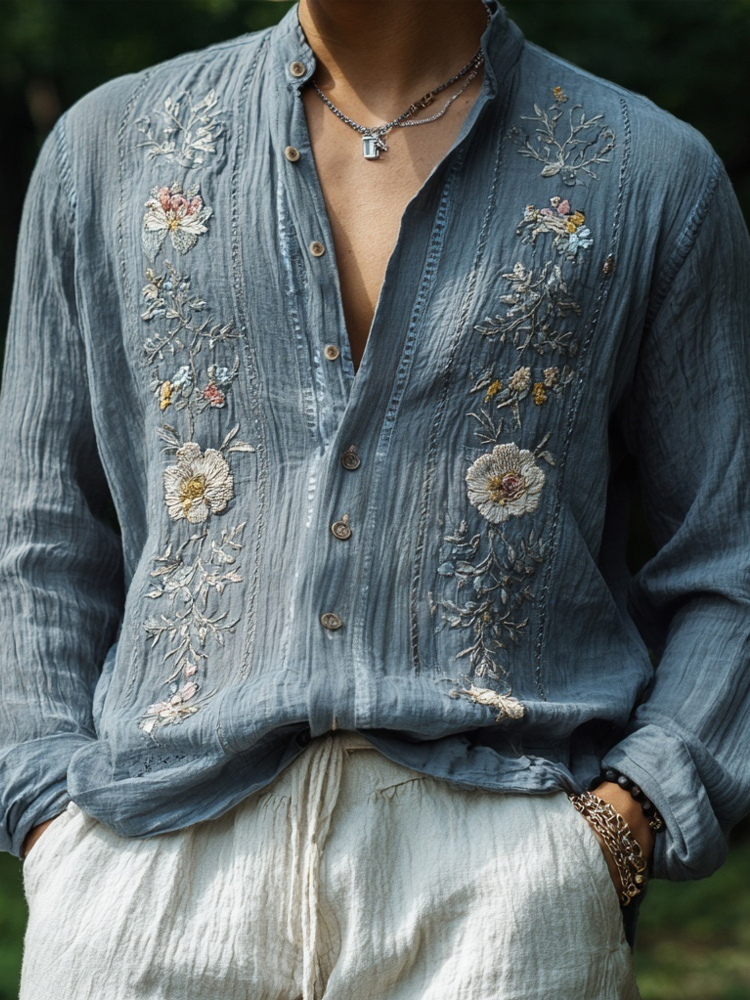 Men's Vintage Floral Embroidered Comfy Linen Shirt