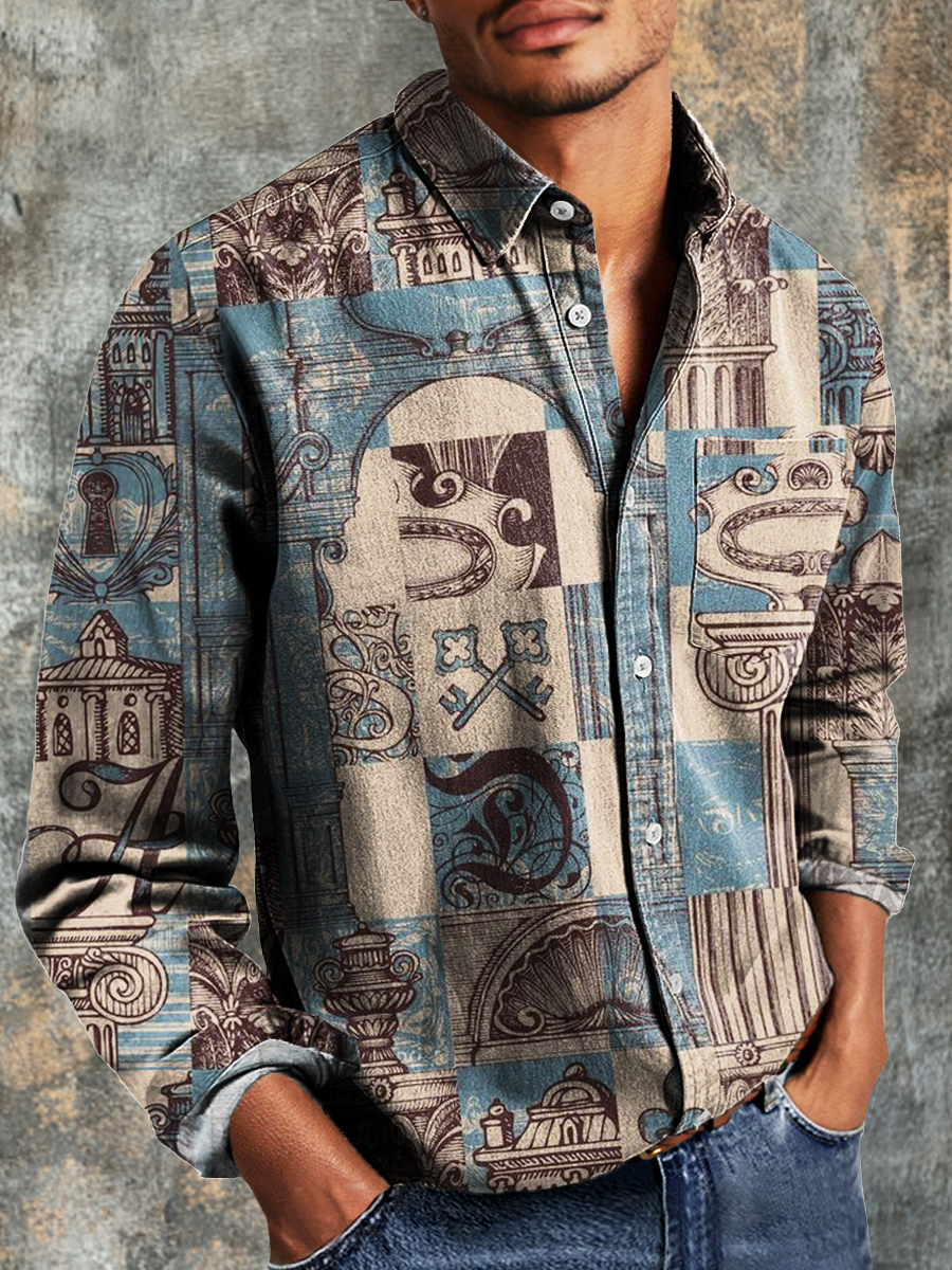 Men's Vintage Geometric Abstract Art Print Long Sleeve Pocket Shirt