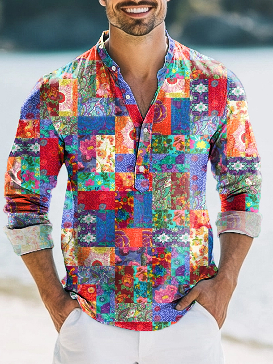 Men's Vintage Geometric Floral Patchwork Art Print Long Sleeve Henley Shirt