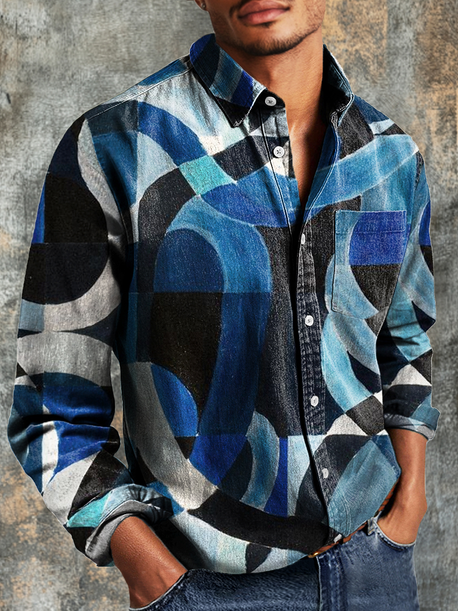 Men's Vintage Geometric Line Art Print Long Sleeve Pocket Shirt