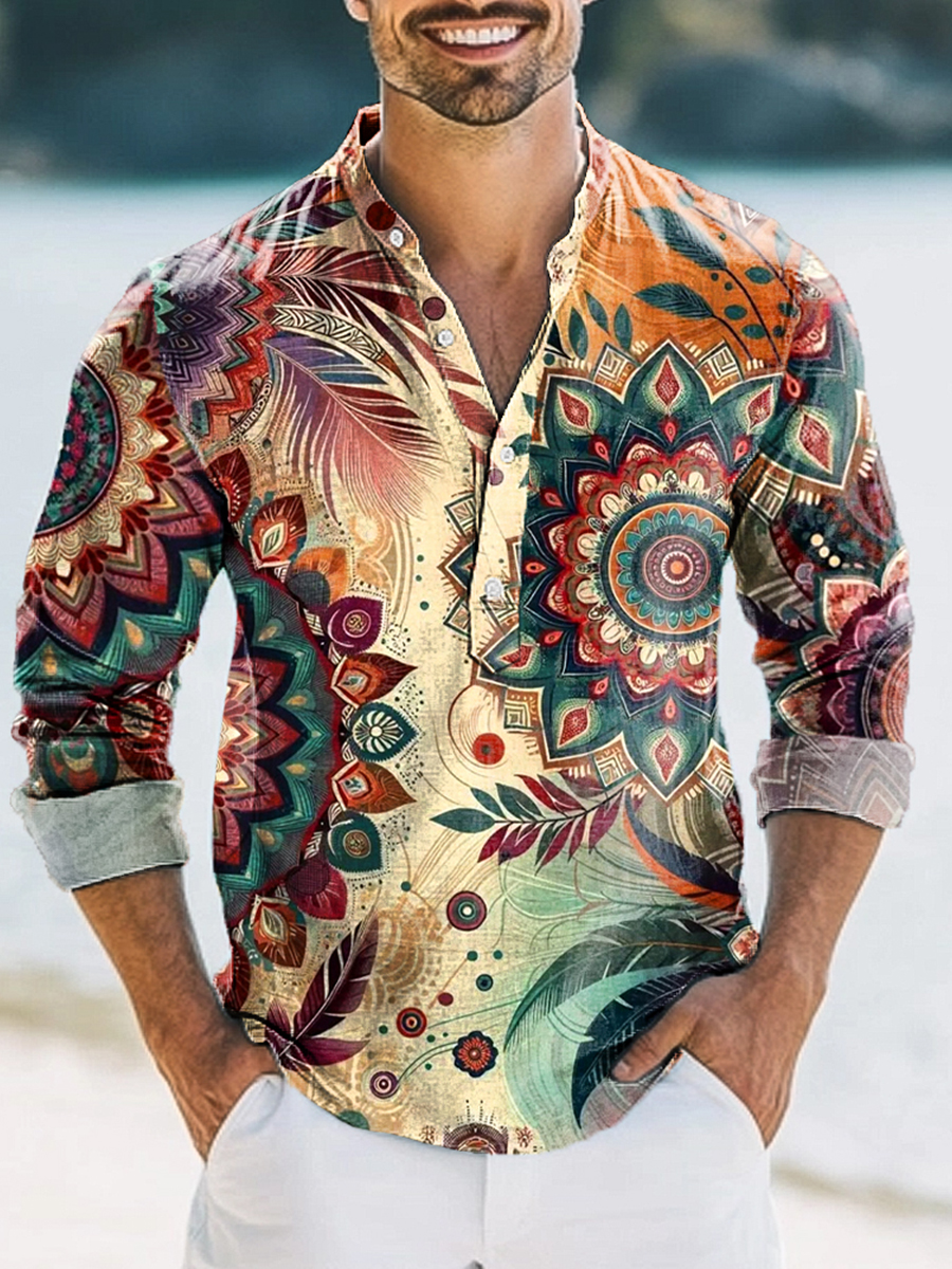Men's Vintage Geometric Totem Feather Art Print Long Sleeve Henley Shirt