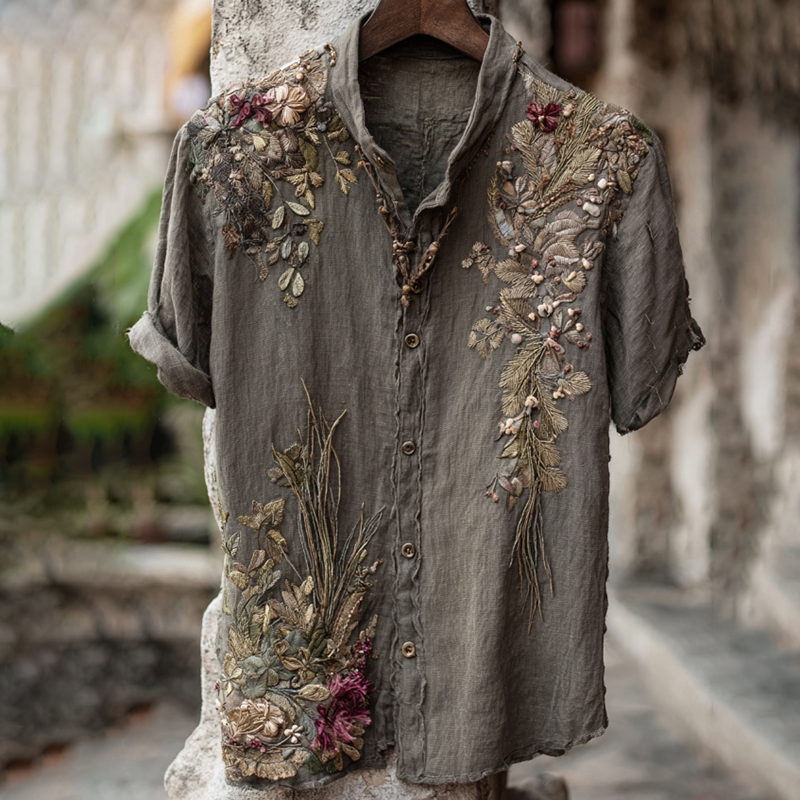 Men's Vintage Gradient Floral Embroidered Art Short Sleeve Linen Shirt