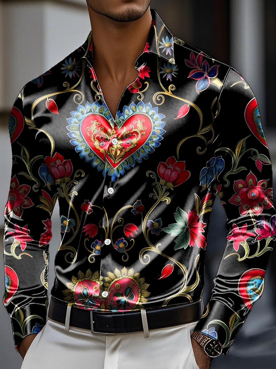 Men's Vintage Heart Symmetrical Floral Print Premium Satin Long Sleeve Shirt