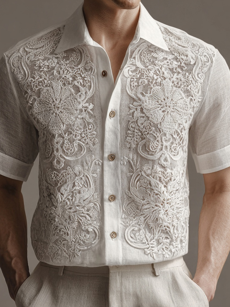 Men's Vintage Lace Flowers Embroidered Linen Shirt