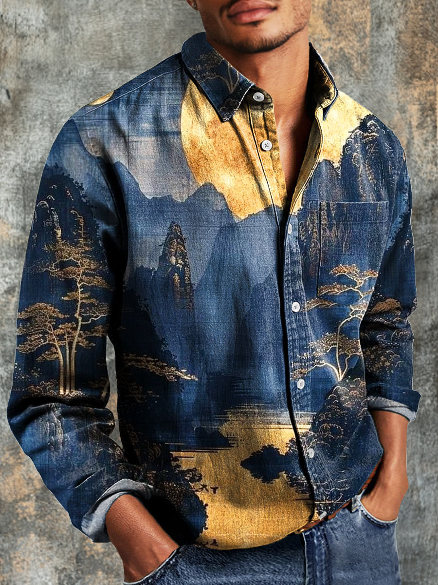 Men's Vintage Landscape Moon Art Print Casual Long Sleeve Shirt