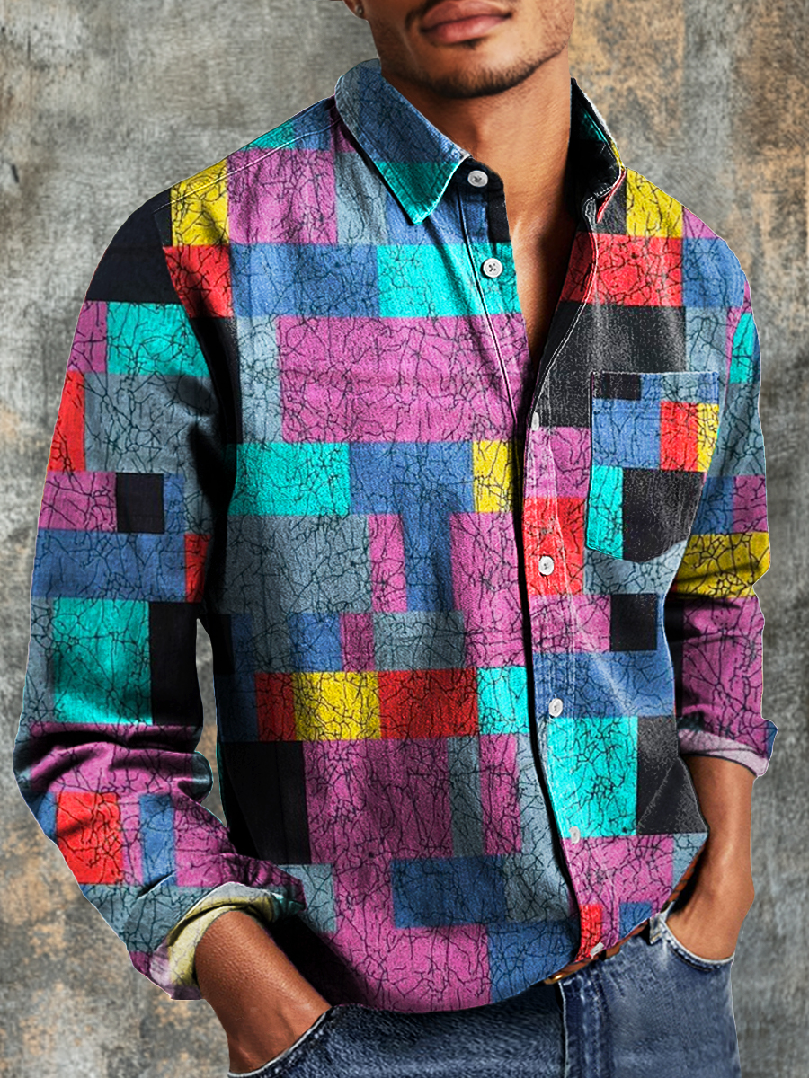 Men's Vintage Line Color Block Art Print Long Sleeve Pocket Shirt