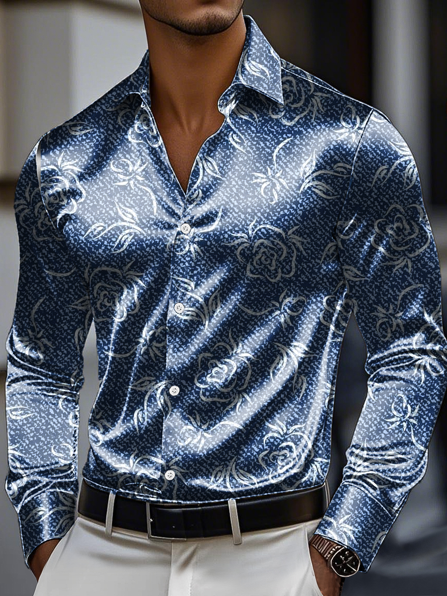 Men's Vintage Line Floral Print Premium Satin Long Sleeve Shirt