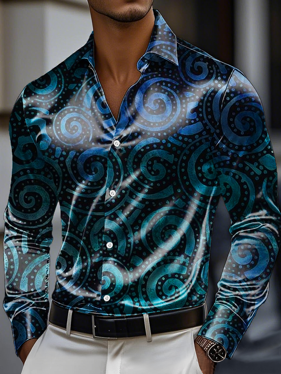 Men's Vintage Line Spiral Art Print Premium Satin Long Sleeve Shirt