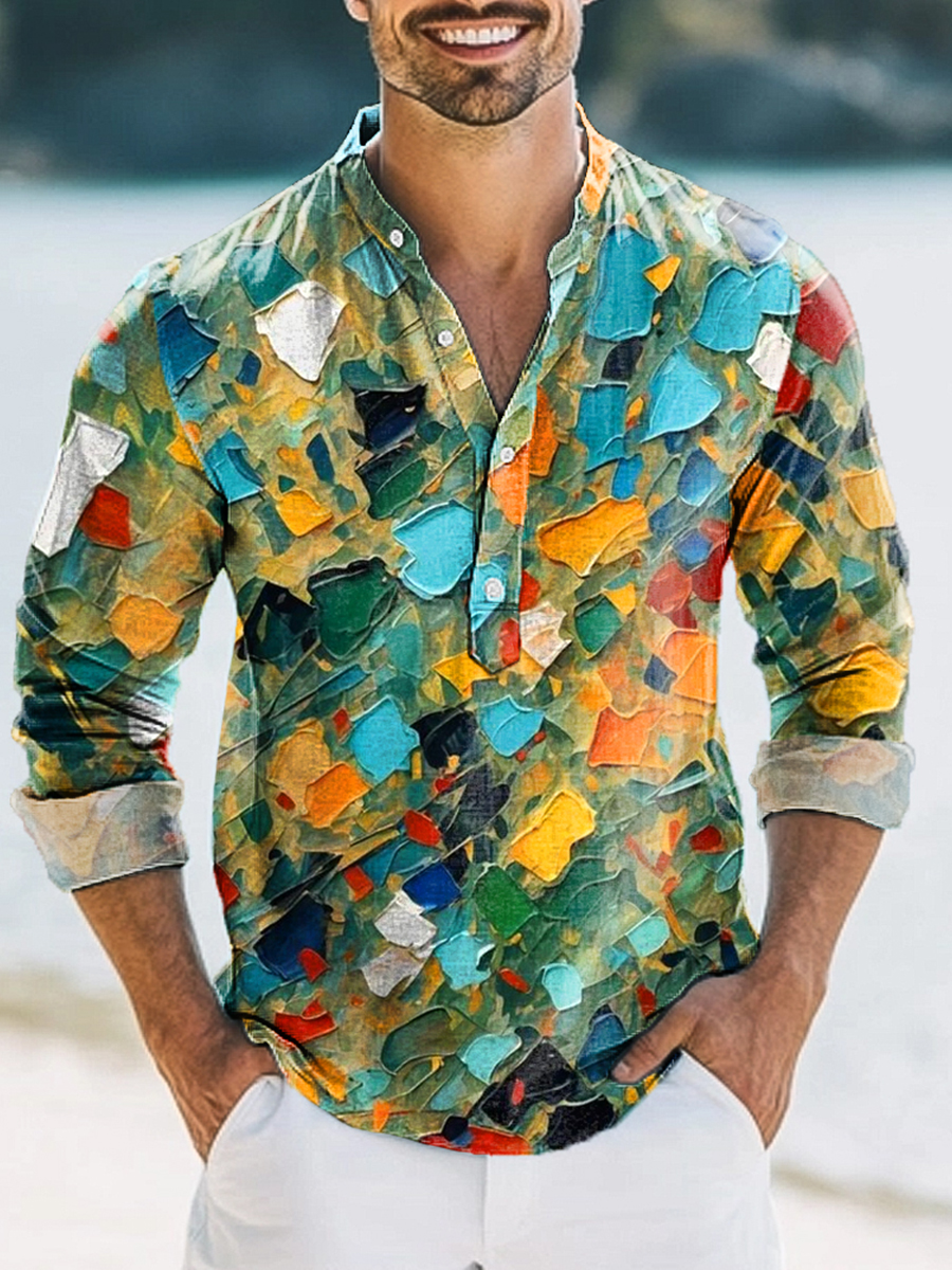 Men's Vintage Multicolor Acrylic Art Print Premium Satin Long Sleeve Shirt