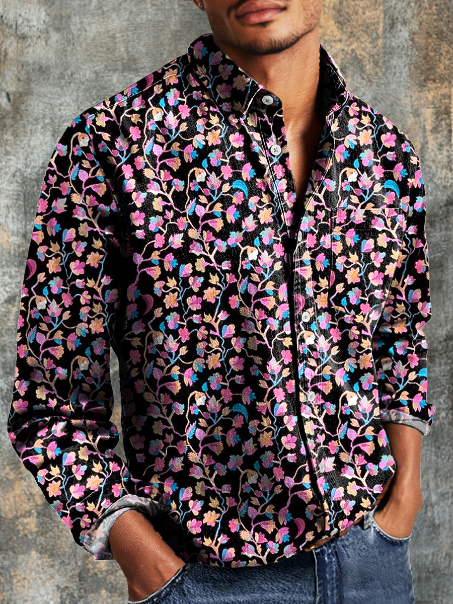 Men's Vintage Multicolor Floral Art Print Long Sleeve Pocket Shirt