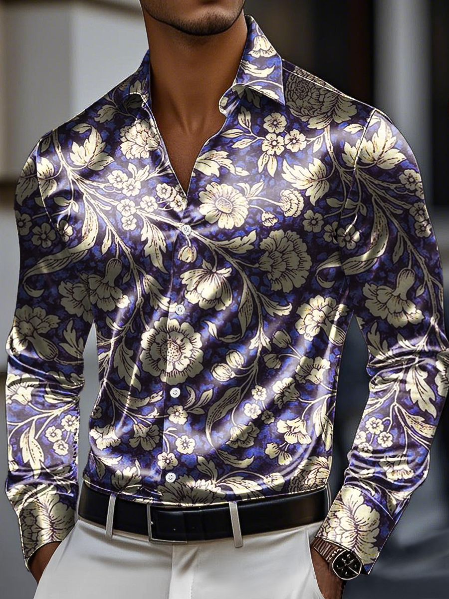 Men's Vintage Romantic Floral Art Print Premium Satin Long Sleeve Shirt