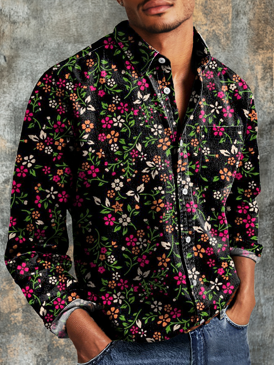 Men's Vintage Rustic Floral Art Print Casual Long Sleeve Shirt