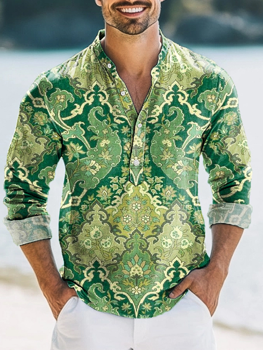 Men's Vintage Symmetrical Floral Art Print Long Sleeve Henley Shirt