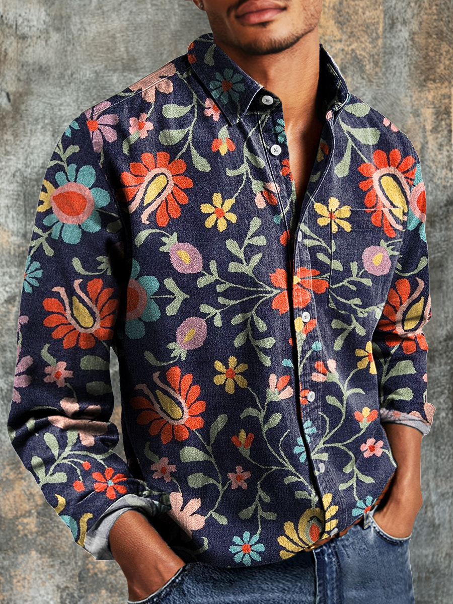 Men's Vintage Symmetrical Floral Art Print Long Sleeve Pocket Shirt