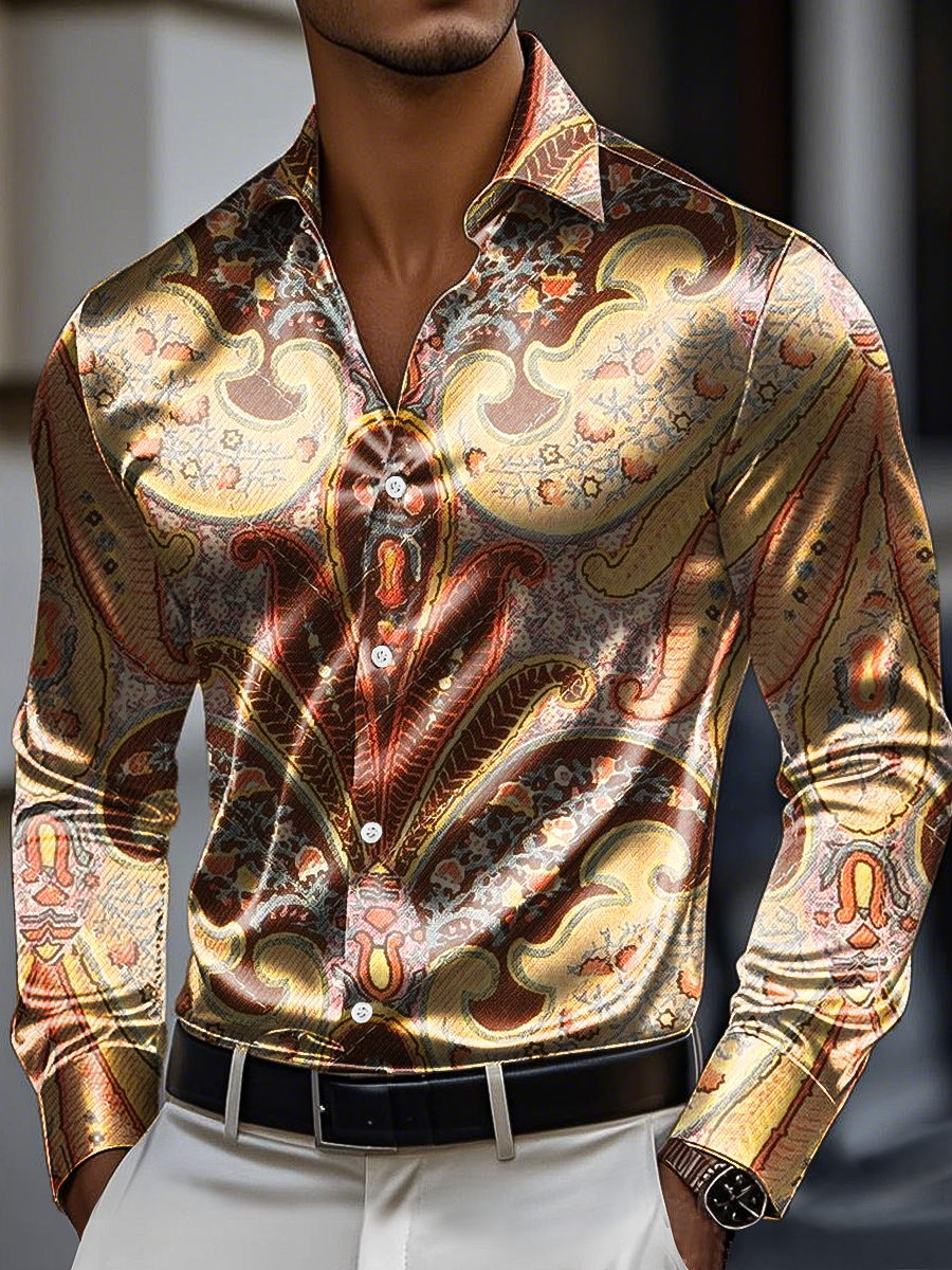 Men's Vintage Symmetrical Paisley Art Print Premium Satin Long Sleeve Shirt
