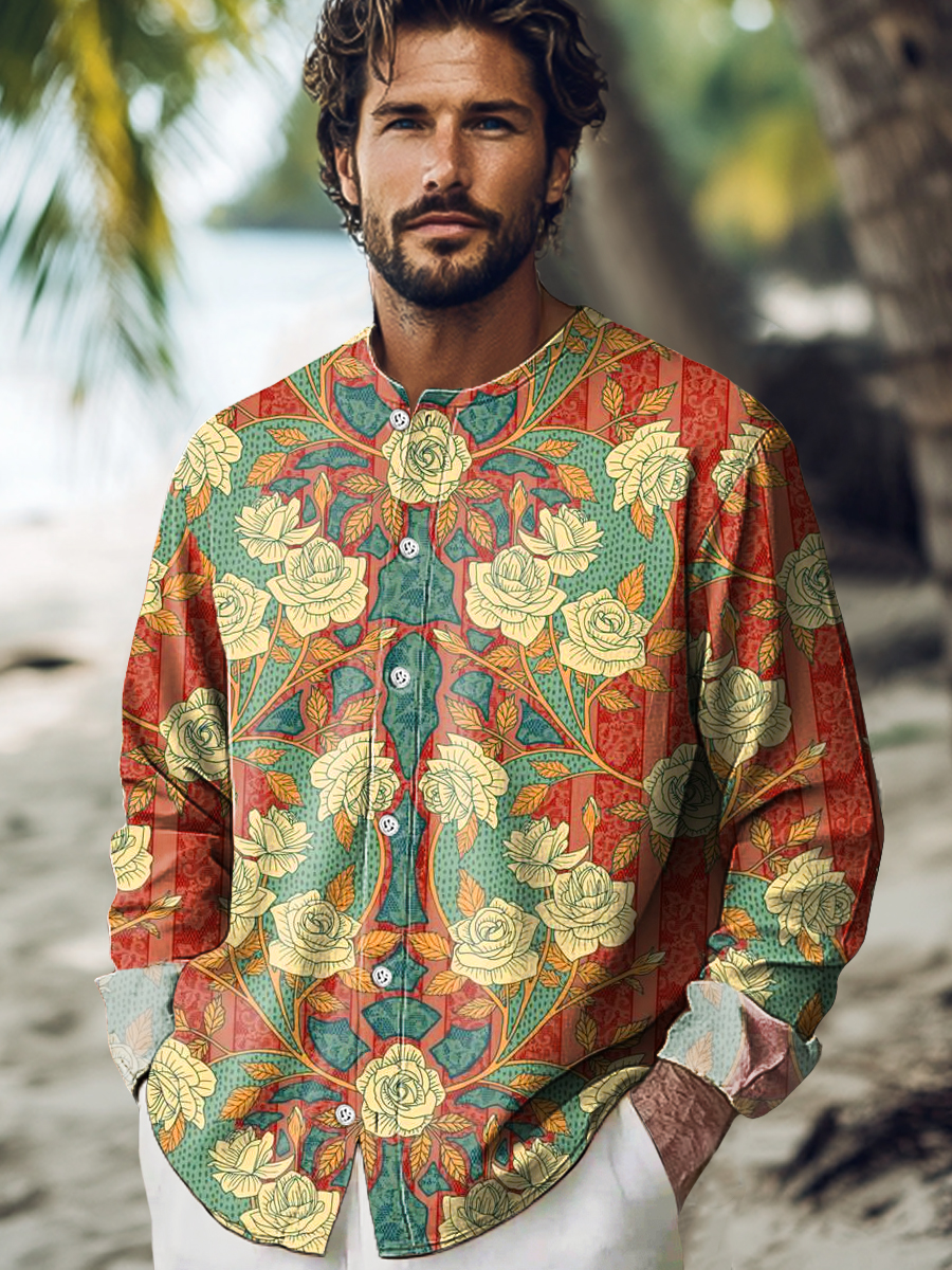 Men's Vintage Tribal Floral Art Print Long Sleeve Pocket Shirt