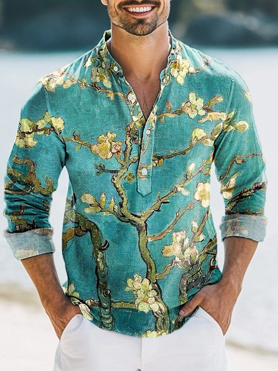 Men's Vintage Twig Floral Art Print Long Sleeve Henley Shirt