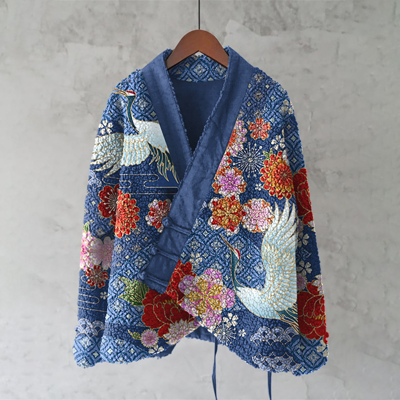 Retro Crane Spring Japanese Art Cozy Fleece Kimono Cardigan