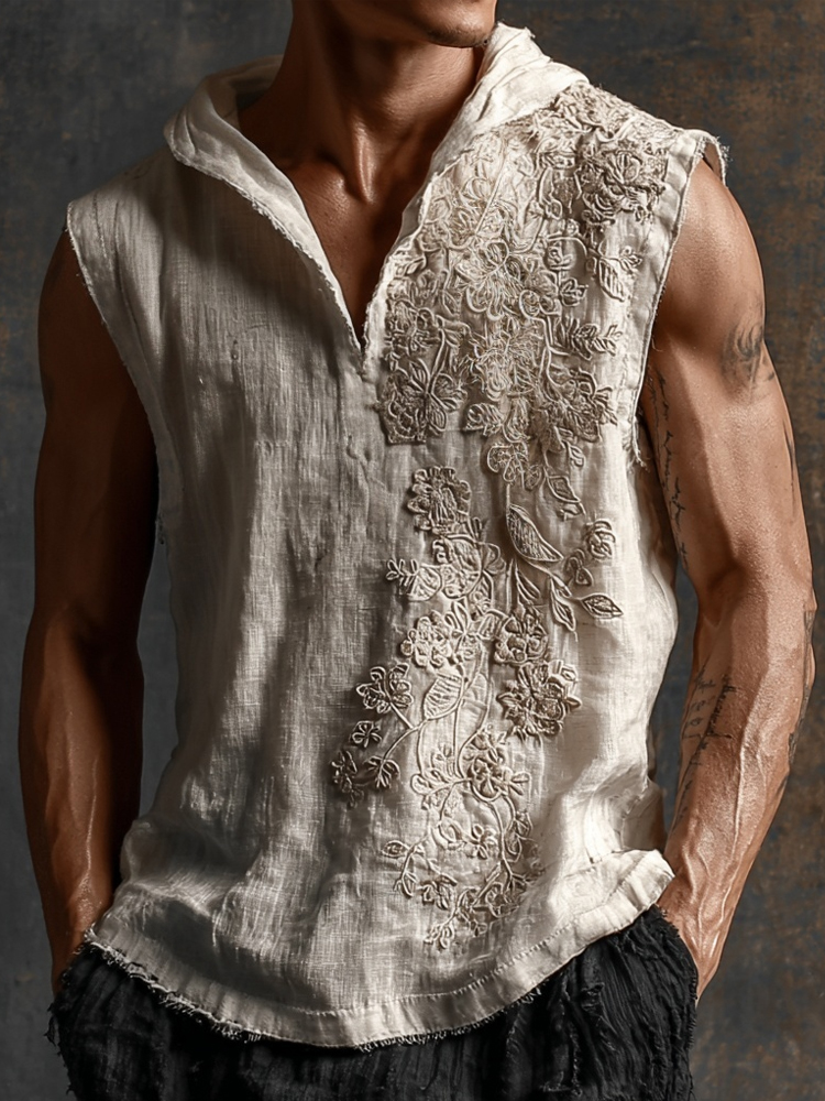 Retro Floral Lace Embroidered Hooded Linen Tank Top
