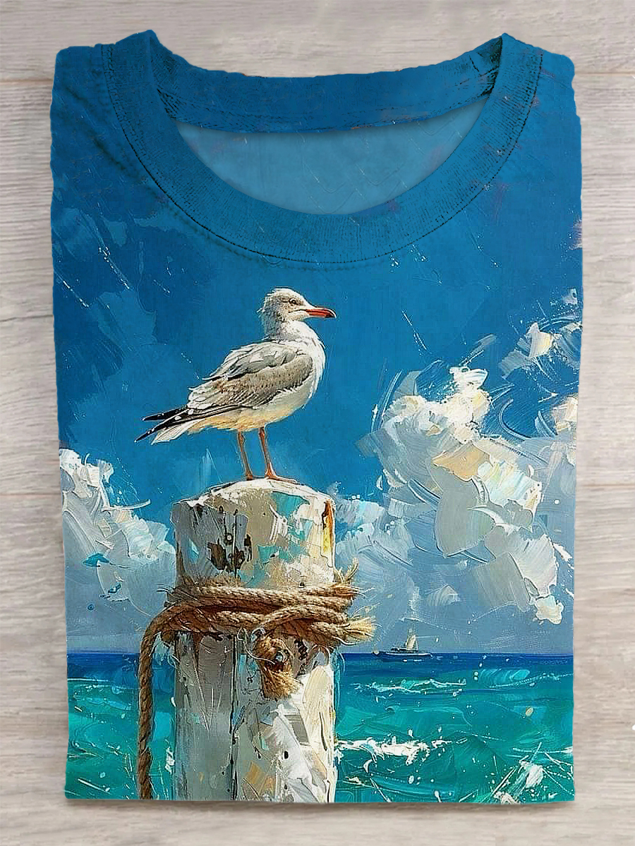 Seagull Printed Vintage Fashion Loose Short Sleeve T-Shirt