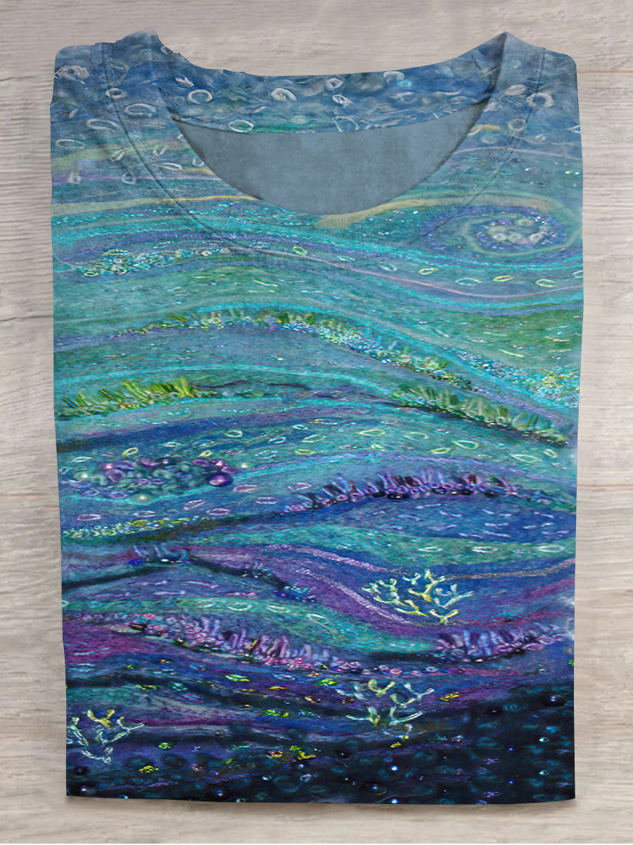 Unisex Abstract Water Pattern Print Casual Round Neck T-Shirt