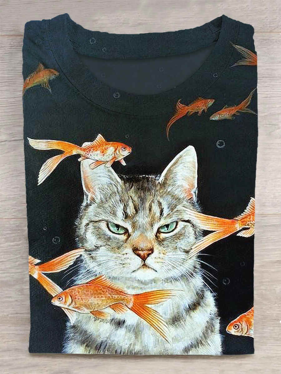 Unisex Cat And Fishes Printed Vintage Fashion Loose Short Sleeve T-Shirt
