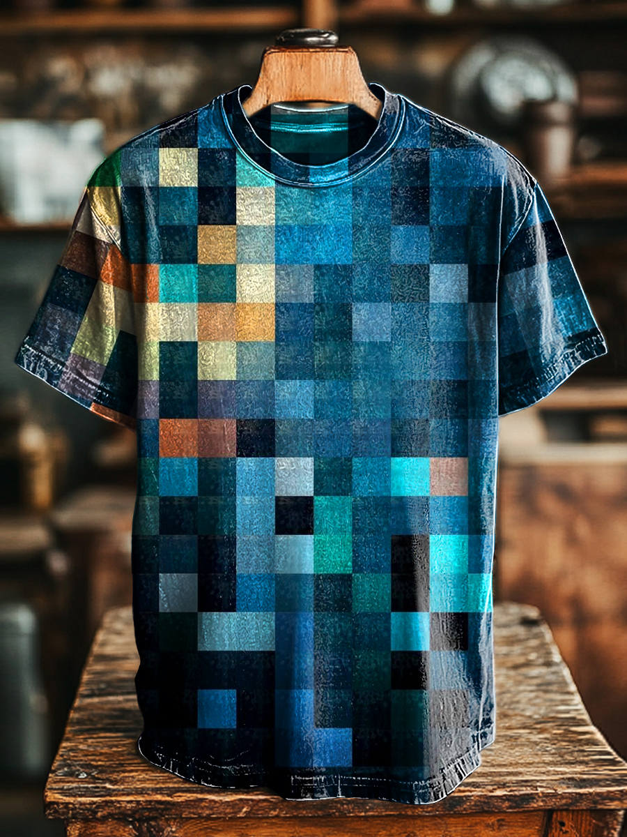 Unisex Retro Colorful Plaid Printed Casual Loose Short Sleeve T-Shirt