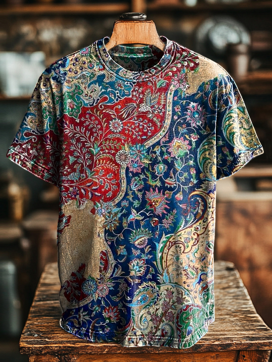 Unisex Retro Floral Splicing Printed Casual Loose Short Sleeve T-Shirt