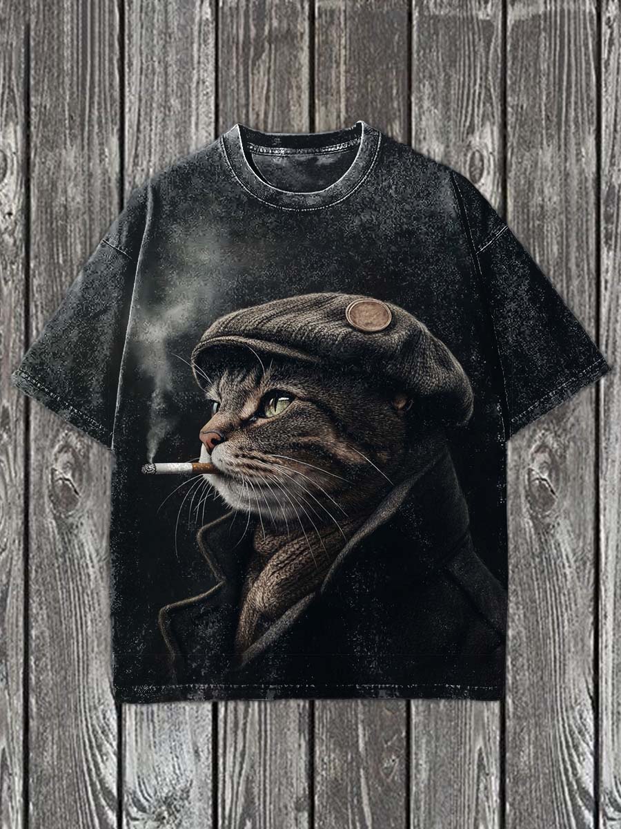 Unisex Smoking Mr. Cat Printed Casual T-Shirt