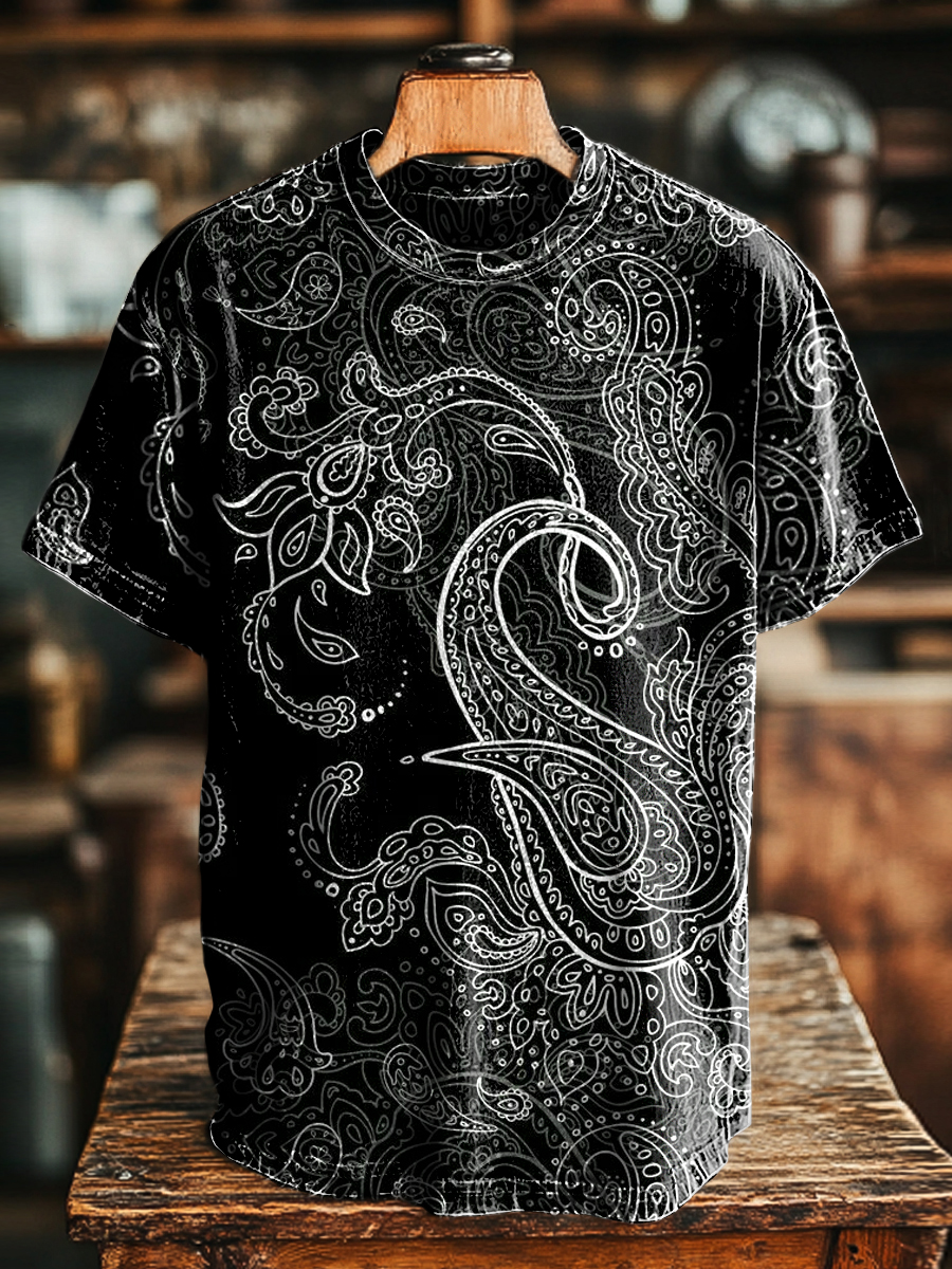 Unisex Vintage Paisley Line Print Casual Loose Short Sleeve T-Shirt
