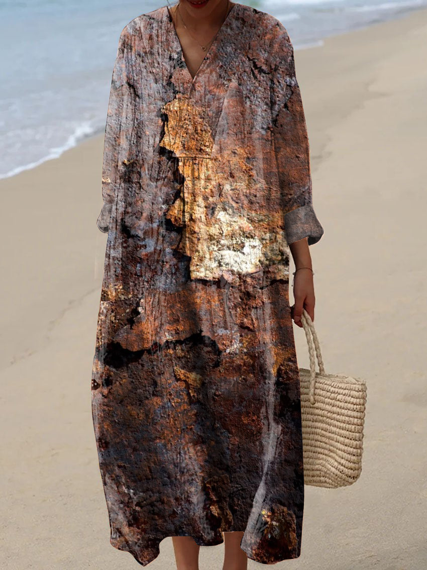 Vintage Distressed Rust Print Long Sleeve Flowing Dress
