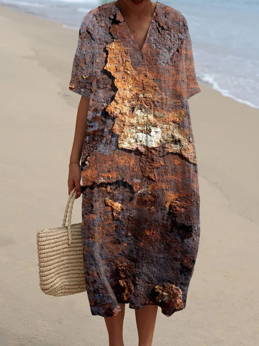 Vintage Distressed Rust Print Short Sleeve Flowy Dress
