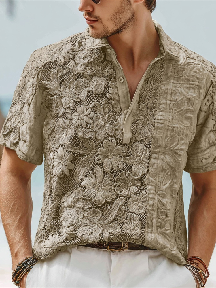 Vintage Floral Embroidery Men's Linen Short Sleeve Shirt